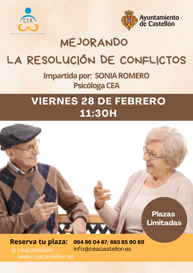 JUEVES 6 DE MARZO A LAS 17:30H CHARLA IMPARTIDA POR CARMEN GONZÁLEZ , PSICÓLOGA VOLUNTARIA DEL TELÉFONO DE LA ESPERANZA. PARA RESERVAR SU PLAZA 964 96 04 67 O BIEN PRESENCIALMENTE EN LA RECEPCIÓN DEL CEA.