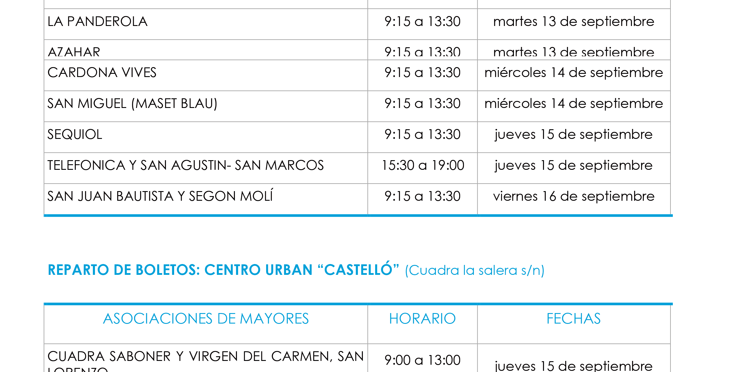 El próximo martes 13 de septiembre arranca la entrega de boletos para los sorteos de las actividades deportivas y socioculturales que se realizan en las asociaciones de mayores de Castellón. Para más información puedes consultar en el siguiente enlace los días, horarios y ubicación, así como las normas de matriculación NORMAS DE MATRICULACIÓN